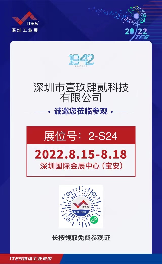 2022年ITES深圳國際工業(yè)制造技術展覽會將于2022年8月15日在深圳國際會展中心(寶安新館)盛大開幕,smt貼片加工廠|深圳市壹玖肆貳科技有限公司|再次亮相2022年ITES深圳工業(yè)展,在此我們真誠的邀請您蒞臨2-S24展位參觀指導,我們期待與您相遇。